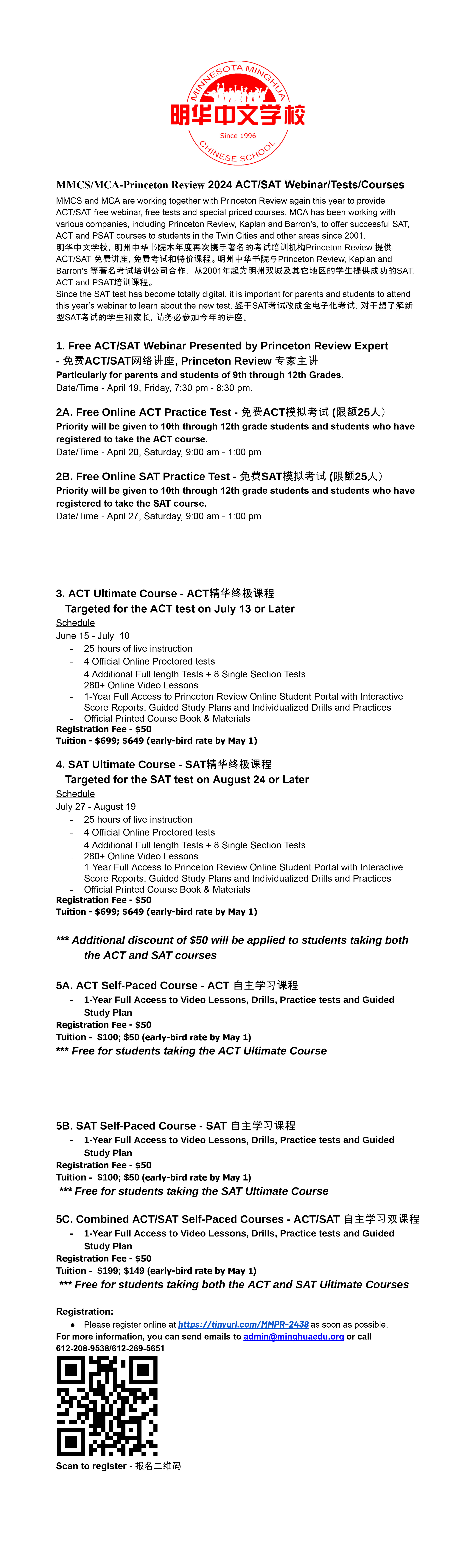 明华中文学校,明州中华书院本年度再次携手著名的考试培训机构Princeton Review,继续为我们的学生提供特价精品课程。Princeton Review 专门为我们的学生单独开班,同时给了我们最大的优惠。这使得我们的学生能够以最优惠的价格获得最精华的课程。这是我们与Princeton Review 长期良好合作的结果,也是我们管理团队一直认真努力付出的结果。希望家长和学生不要错过机会。除了特价特设课程外,Princeton Review 继续为我们提供免费网络讲座和免费SAT/ACT模拟考试。鉴于SAT考试的重大改变,今年4月19号周五中部时间晚上7:30-8:30的讲座尤为重要。希望家长和学生不要错过。以下是报名参加免费网络讲座,免费SAT/ACT模拟考试和特价精品课程的链接。 https://tinyurl.com/MMPR-2438 谢谢!